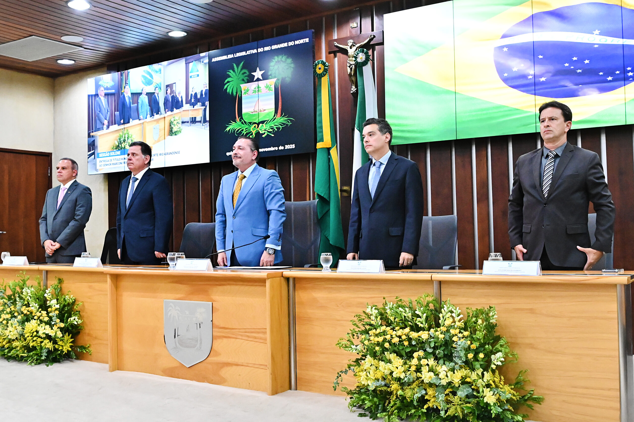 A Assembleia Legislativa do Rio Grande do Norte realizou, nesta quinta-feira (6), uma sessão solene para conceder o título de cidadão norte-rio-grandense ao ex-governador de Goiás e presidente nacional do PSDB, Marconi Ferreira Perillo Júnior. A homenagem foi proposta pelo presidente da Casa, deputado Ezequiel Ferreira (PSDB), e contou com a presença de diversas autoridades, entre elas o vice-governador Walter Alves e o vereador Aldo Clemente.